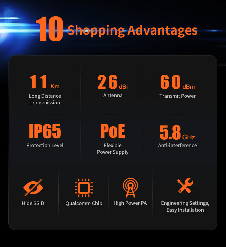 IP65 ওয়েদারপ্রুফ ডিজাইন, উচ্চ-গেইন অ্যান্টেনা, এবং PoE সমর্থনের মাধ্যমে এটি নিশ্চিত করে স্থিতিশীল ও নির্ভরযোগ্য নেটওয়ার্ক। ISP, ক্যাম্পাস, বিল্ডিং-টু-বিল্ডিং, ফার্ম বা বাণিজ্যিক নেটওয়ার্কের জন্য আদর্শ সমাধান।